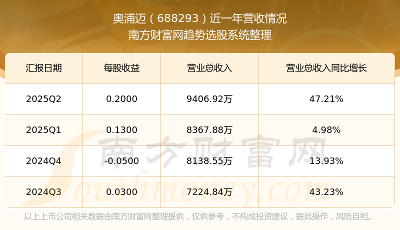 奧浦邁2025年第二季度公司實(shí)現(xiàn)營(yíng)業(yè)收入9406.92萬(wàn)元,同比47.21%;歸母凈利潤(rùn)2287.89萬(wàn)元,同比401.78%。