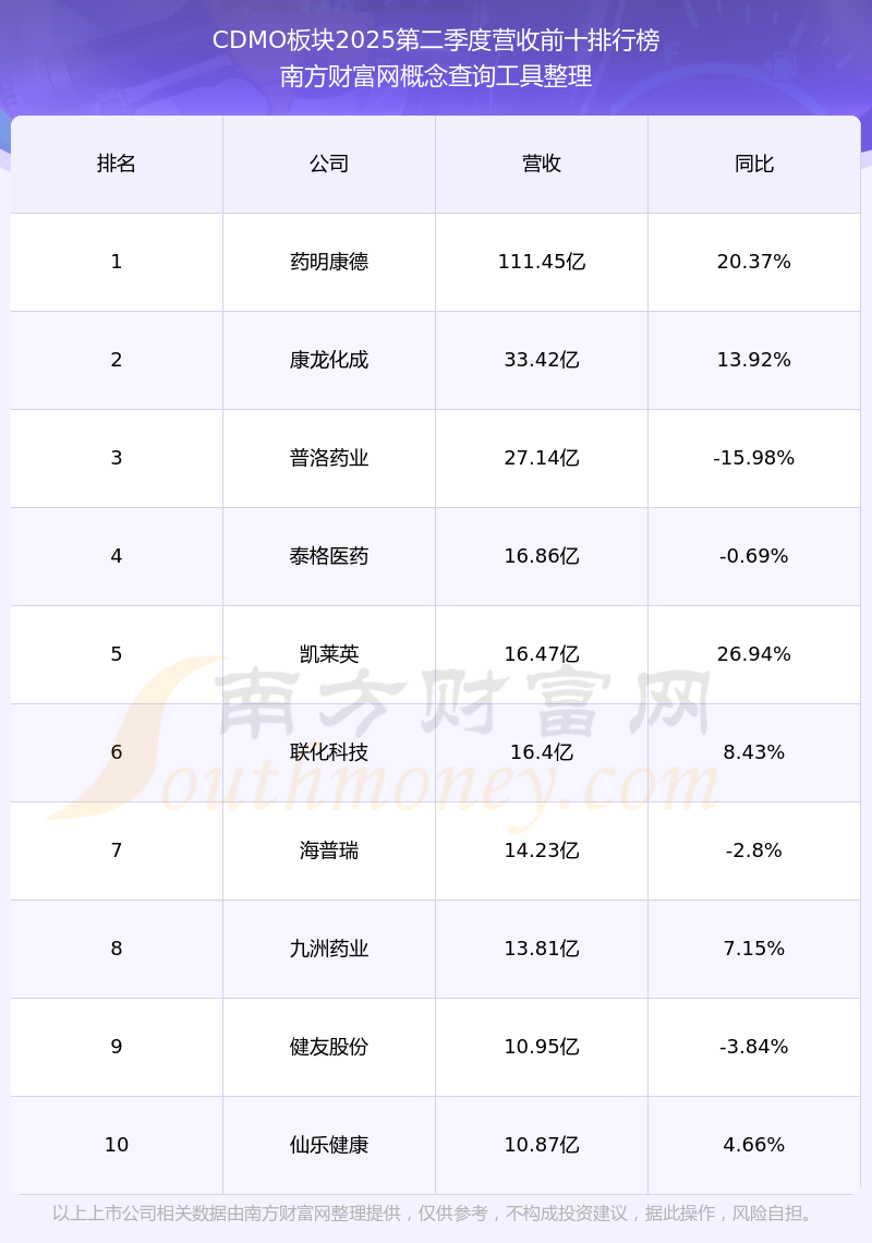 按照南方財(cái)富網(wǎng)概念查詢工具統(tǒng)計(jì),該股所屬板塊為CDMO板塊,該板塊共有33只股票,奧浦邁2025第二季度營(yíng)收在該板塊中排名為第33名,該板塊2025第二季度營(yíng)收排名前十的股票如下表: