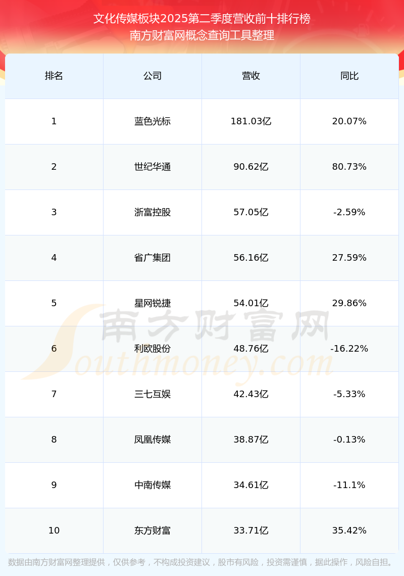 按照南方財(cái)富網(wǎng)概念查詢工具統(tǒng)計(jì),該股所屬板塊為文化傳媒板塊,該板塊共有242只股票,華揚(yáng)聯(lián)眾2025第二季度營收在該板塊中排名為第101名,該板塊2025第二季度營收排名前十的股票如下表: