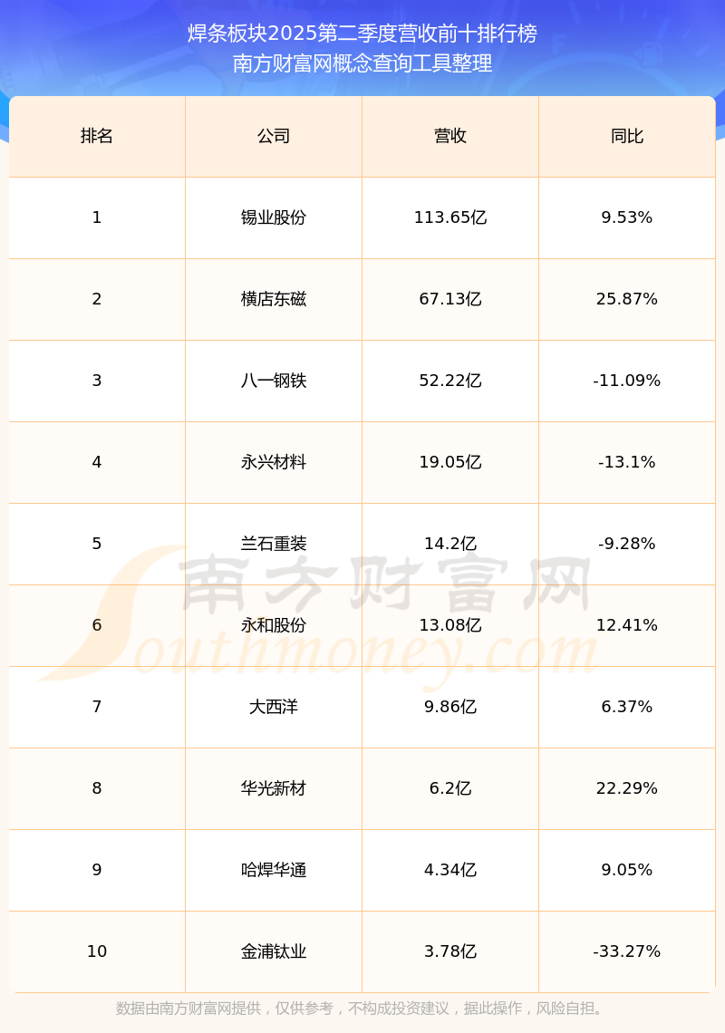 按照南方財(cái)富網(wǎng)概念查詢工具統(tǒng)計(jì),該股所屬板塊為焊條板塊,該板塊共有16只股票,大西洋2025第二季度營收在該板塊中排名為第7名,該板塊2025第二季度營收排名前十的股票如下表: