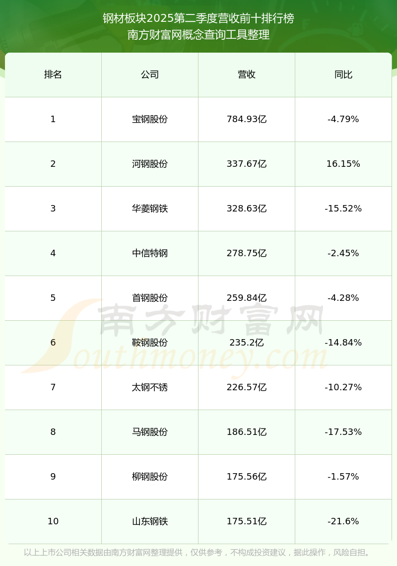 按照南方財(cái)富網(wǎng)概念查詢工具統(tǒng)計(jì),該股所屬板塊為鋼材板塊,該板塊共有30只股票,馬鋼股份2025第二季度營(yíng)收在該板塊中排名為第8名,該板塊2025第二季度營(yíng)收排名前十的股票如下表: