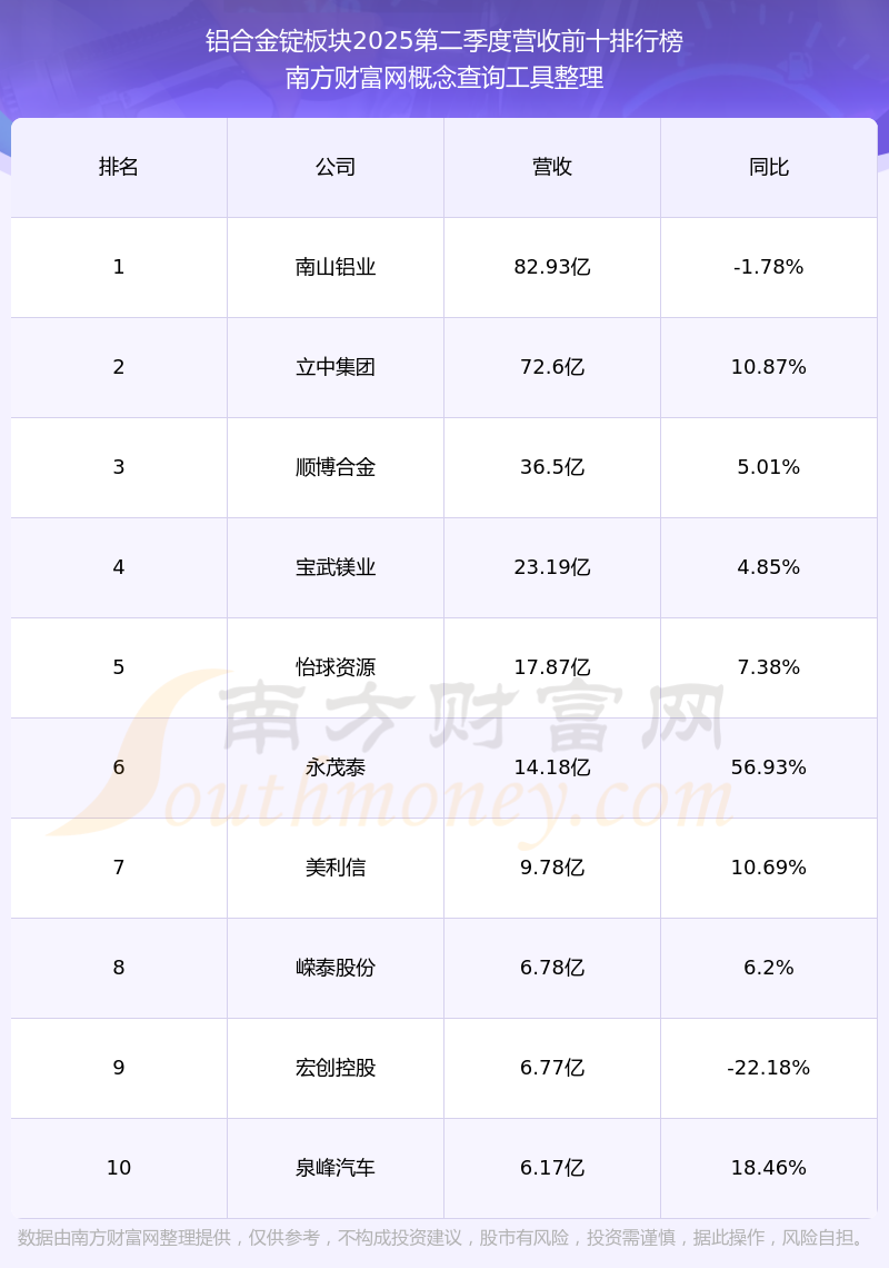 按照南方財富網(wǎng)概念查詢工具統(tǒng)計,該股所屬板塊為鋁合金錠板塊,該板塊共有15只股票,永茂泰2025第二季度營收在該板塊中排名為第6名,該板塊2025第二季度營收排名前十的股票如下表: