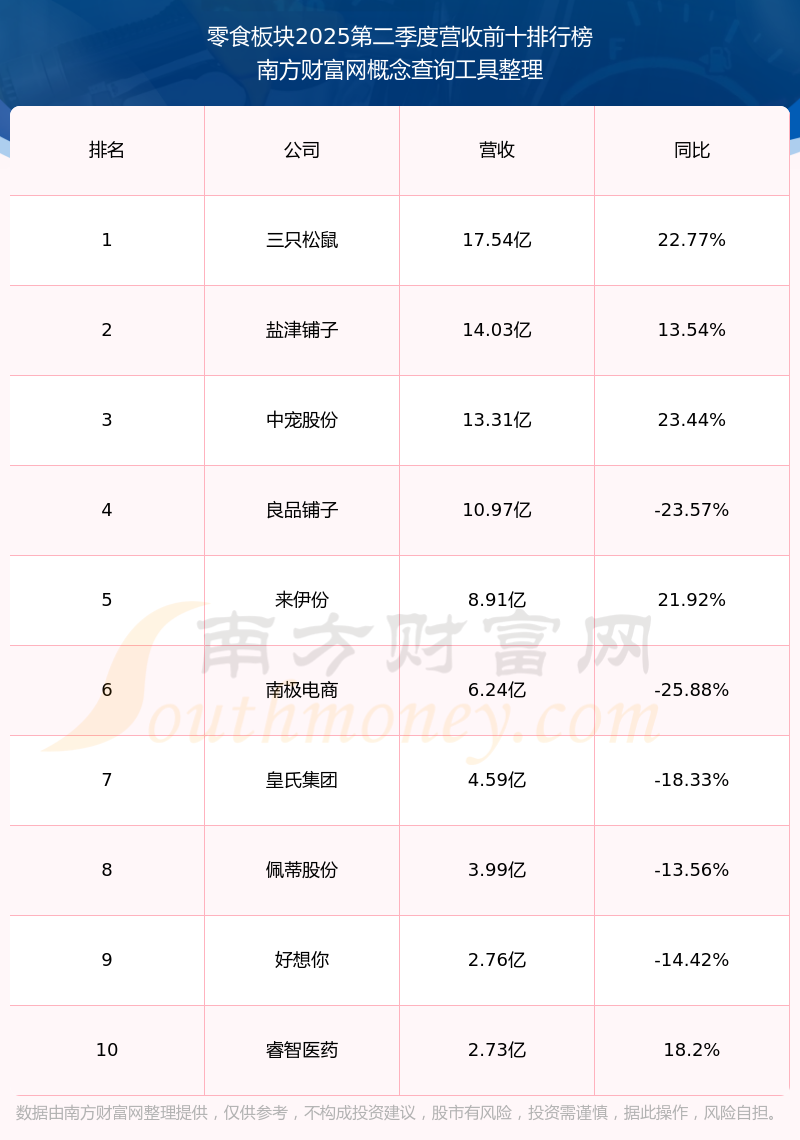 按照南方財富網(wǎng)概念查詢工具統(tǒng)計,該股所屬板塊為零食板塊,該板塊共有11只股票,良品鋪子2025第二季度營收在該板塊中排名為第4名,該板塊2025第二季度營收排名前十的股票如下表: