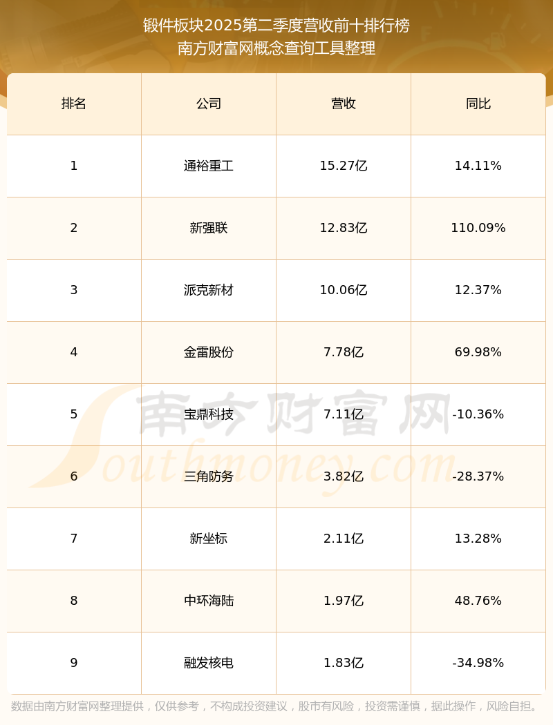按照南方財(cái)富網(wǎng)概念查詢工具統(tǒng)計(jì),該股所屬板塊為鍛件板塊,該板塊共有9只股票,派克新材2025第二季度營(yíng)收在該板塊中排名為第3名,該板塊2025第二季度營(yíng)收排名前十的股票如下表: