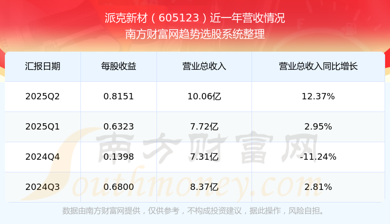 派克新材2025年第二季度顯示,公司主營(yíng)收入10.06億元,同比12.37%;歸母凈利潤(rùn)9877.16萬元,同比6.69%;扣非凈利潤(rùn)9777.03萬元,同比11.96%;