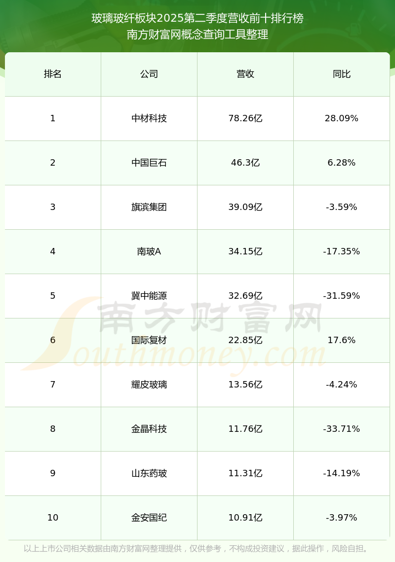 按照南方財富網(wǎng)概念查詢工具統(tǒng)計,該股所屬板塊為玻璃玻纖板塊,該板塊共有23只股票,中國巨石2025第二季度營收在該板塊中排名為第2名,該板塊2025第二季度營收排名前十的股票如下表: