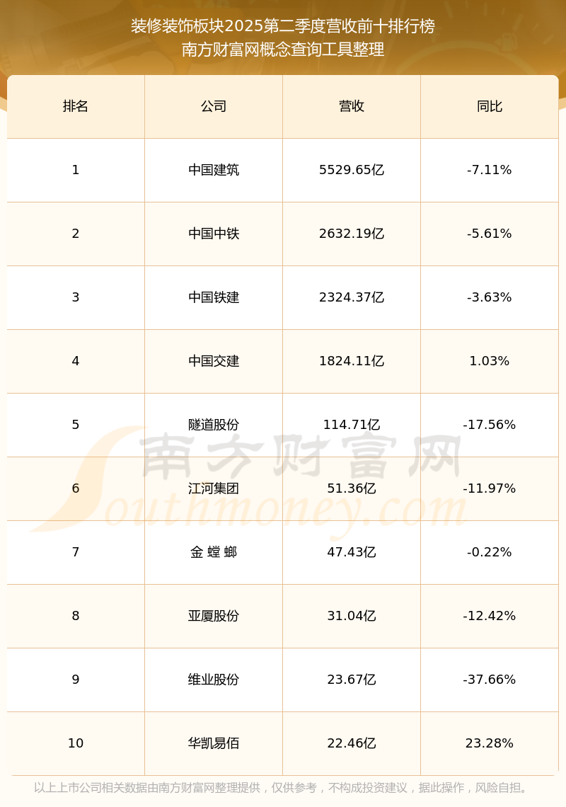 按照南方財富網(wǎng)概念查詢工具統(tǒng)計(jì),該股所屬板塊為裝修裝飾板塊,該板塊共有59只股票,聯(lián)翔股份2025第二季度營收在該板塊中排名為第57名,該板塊2025第二季度營收排名前十的股票如下表: