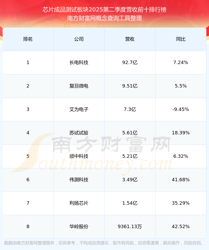 按照南方財(cái)富網(wǎng)概念查詢工具統(tǒng)計(jì),該股所屬板塊為芯片成品測試板塊,該板塊共有8只股票,偉測科技2025第二季度營收在該板塊中排名為第6名,該板塊2025第二季度營收排名前十的股票如下表: