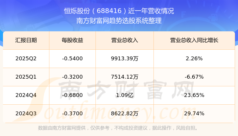 于2025年第二季度,恒爍股份披露了其業(yè)績表現(xiàn),其中主營業(yè)務(wù)收入9913.39萬元,相較于去年同期2.26%。此外,公司歸屬于母公司的凈利潤為-4445.09萬元,同比增長了-7.64%。在扣除所有非經(jīng)常性損益后,凈利潤-4637.43萬元,同比增長-0.14%。