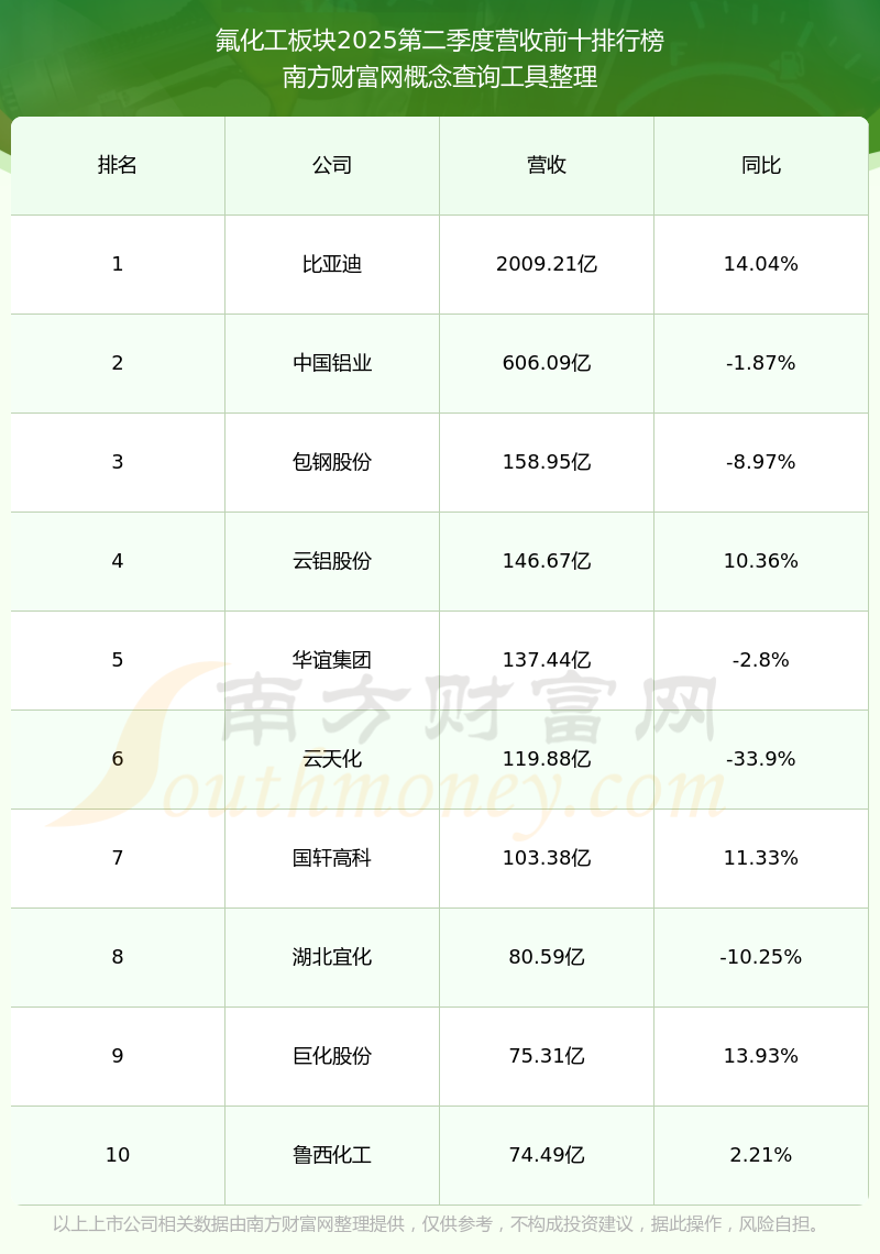 按照南方財(cái)富網(wǎng)概念查詢工具統(tǒng)計(jì),該股所屬板塊為氟化工板塊,該板塊共有46只股票,巍華新材2025第二季度營(yíng)收在該板塊中排名為第39名,該板塊2025第二季度營(yíng)收排名前十的股票如下表: