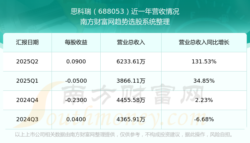 思科瑞披露了2025年第二季度財(cái)報(bào)。報(bào)告顯示,思科瑞2025年第二季度實(shí)現(xiàn)營收6233.61萬元,同比131.53%;歸母凈利潤888.61萬元,同比226.21%。