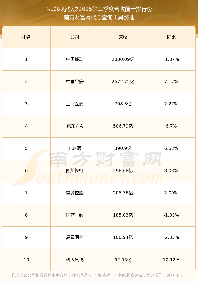 按照南方財富網(wǎng)概念查詢工具統(tǒng)計,該股所屬板塊為互聯(lián)醫(yī)療板塊,該板塊共有130只股票,三星醫(yī)療2025第二季度營收在該板塊中排名為第14名,該板塊2025第二季度營收排名前十的股票如下表: