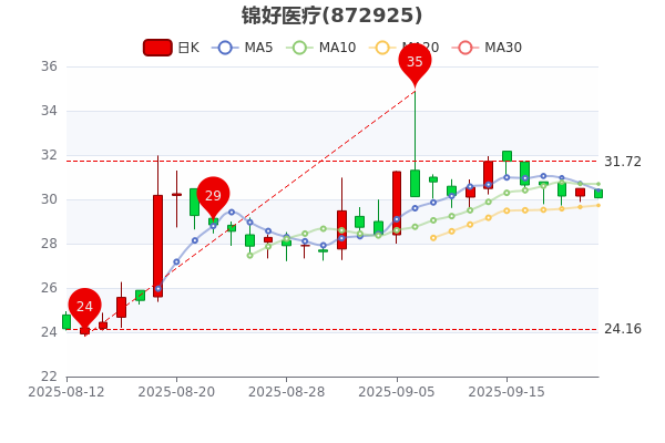 9月22日盤中消息,錦好醫(yī)療最新報(bào)價(jià)30.130元,跌1.38%,3日內(nèi)股價(jià)上漲0.2%;今年來漲幅上漲61.65%,市盈率為502.17。