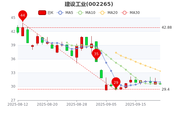9月22日盤(pán)中最新消息,建設(shè)工業(yè)昨收31.08元,截至10時(shí)01分,該股跌1.8%報(bào)30.760元 。