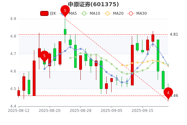 9月22日訊息,中原證券3日內(nèi)股價下跌6.89%,市值為207.07億元,跌0.89%,最新報4.460元。