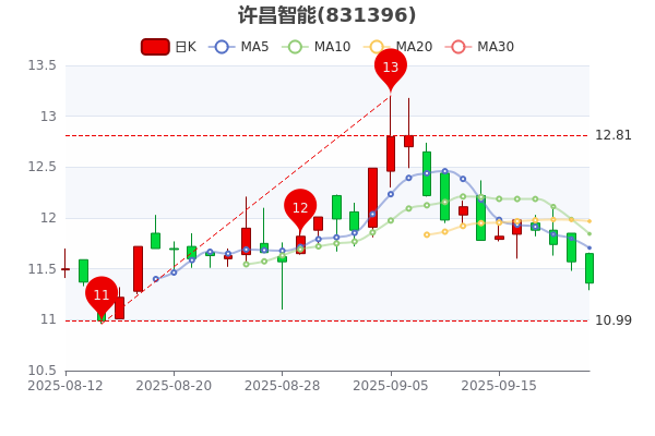 截至11時(shí)27分,許昌智能(831396)目前跌1.82%,股價(jià)報(bào)11.390元,成交216.02萬手,成交金額2463.08萬元,換手率1.49%。