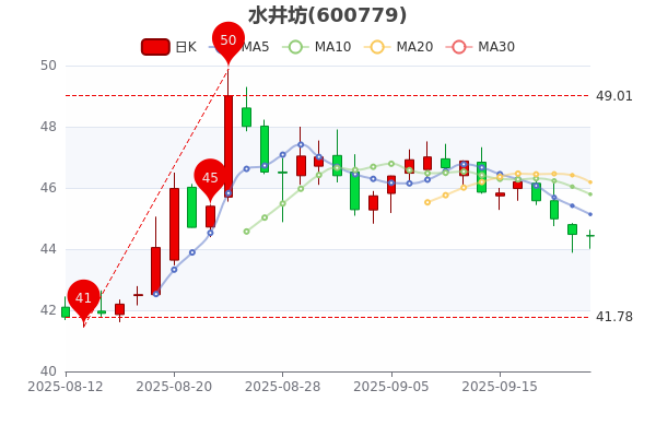 9月22日上午收盤消息,水井坊跌0.11%,最新報44.430元,成交金額6418.66萬元,換手率0.3%,振幅跌0.11%。