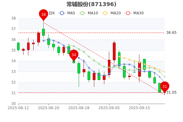 9月22日常輔股份(871396)開盤報(bào)31.19元,成交2017.56萬(wàn)元,換手率1.28%。