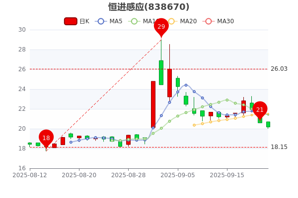 公司主營業(yè)務(wù)包括感應(yīng)熱處理淬火機(jī)床設(shè)備。9月22日恒進(jìn)感應(yīng)消息,該股開盤報(bào)20.7元,截至15點(diǎn),該股跌2.04%,報(bào)20.170元,當(dāng)日最高價(jià)為20.7元。換手率4.57%。