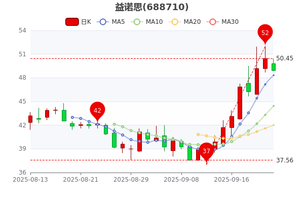 9月23日益諾思(688710)公布,截至10時(shí)01分,益諾思股價(jià)報(bào)49.310元,跌3.03%,市值為69.52億元,近5日內(nèi)股價(jià)上漲14.53%,成交金額2282.78萬(wàn)元。