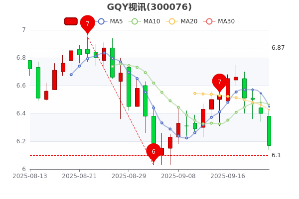 9月23日消息,GQY視訊(300076)盤(pán)中跌3.59%,報(bào)6.170元/股,成交量304.57萬(wàn)手,換手率0.72%,振幅跌3.59%。