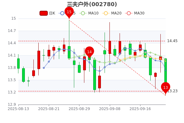 9月23日消息,三夫戶外最新報(bào)價(jià)13.280元,3日內(nèi)股價(jià)上漲3.2%;今年來漲幅上漲10.09%,市盈率為-94.86。