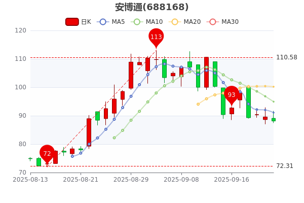 9月23日消息,安博通5日內(nèi)股價(jià)下跌3.53%,今年來(lái)漲幅上漲56.35%,最新報(bào)87.620元,市盈率為-56.53。
