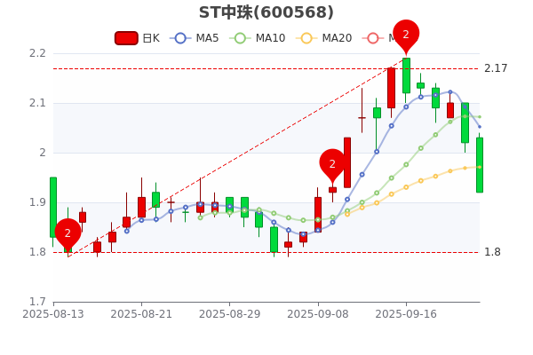 9月23日訊息,ST中珠3日內(nèi)股價下跌3.47%,市值為38.26億元,跌4.95%,最新報1.920元。