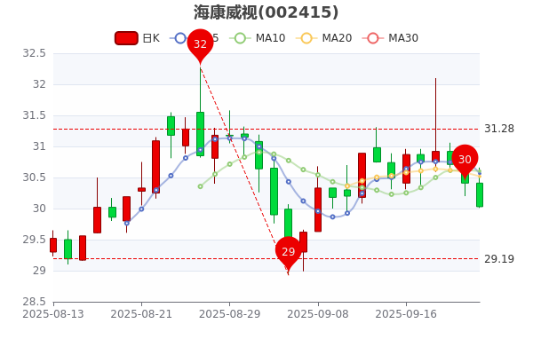 9月23日海康威視消息,該股11時41分報30.030元,跌1.25%,換手率0.39%,成交量3552.38萬手,今年來下跌-0.95%。