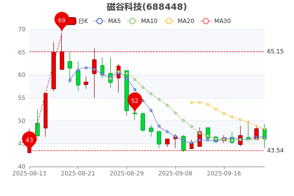 截至9月23日下午3點收盤,磁谷科技(688448)報46.020元,跌4.72%,當(dāng)日最高價為49.28元,換手率10.22%,PE(市盈率)為63.92,成交額2.25億元。