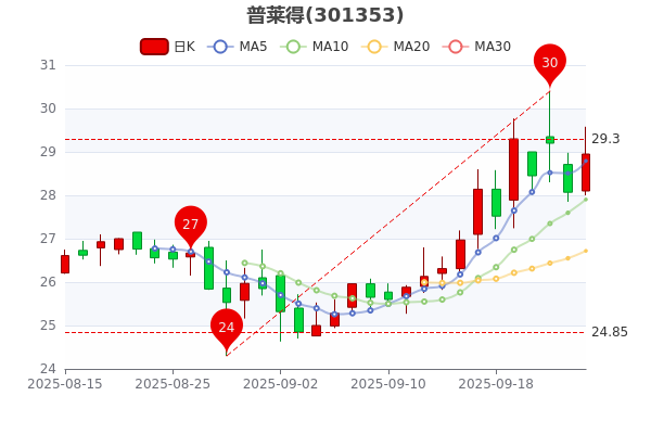 9月25日,普萊得收盤漲3.14%,報于28.950。當(dāng)日最高價為29.58元,最低達28元,成交量425.51萬手,總市值為28.42億元。