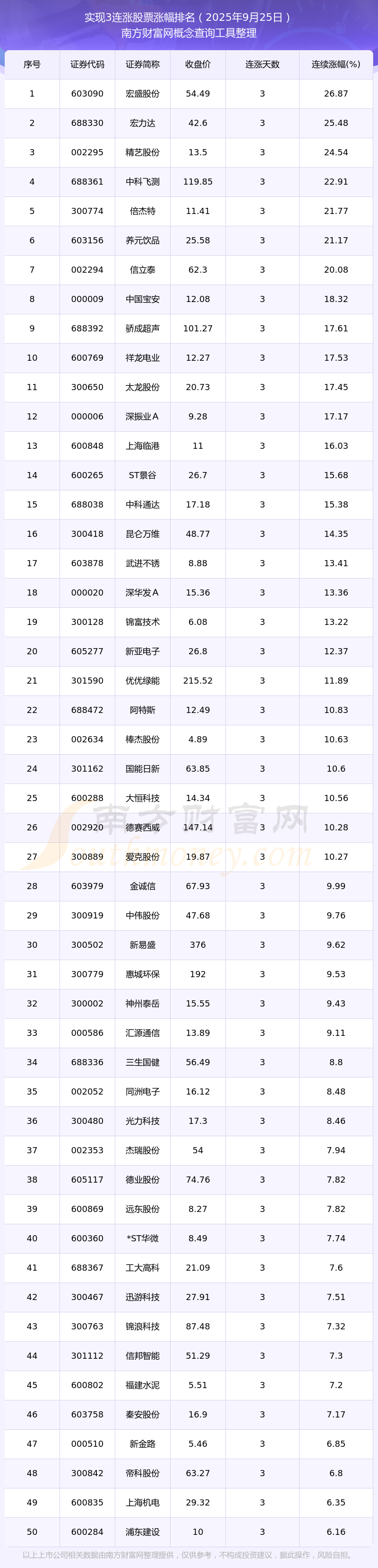2025年9月25日實(shí)現(xiàn)3連漲股票漲幅排名