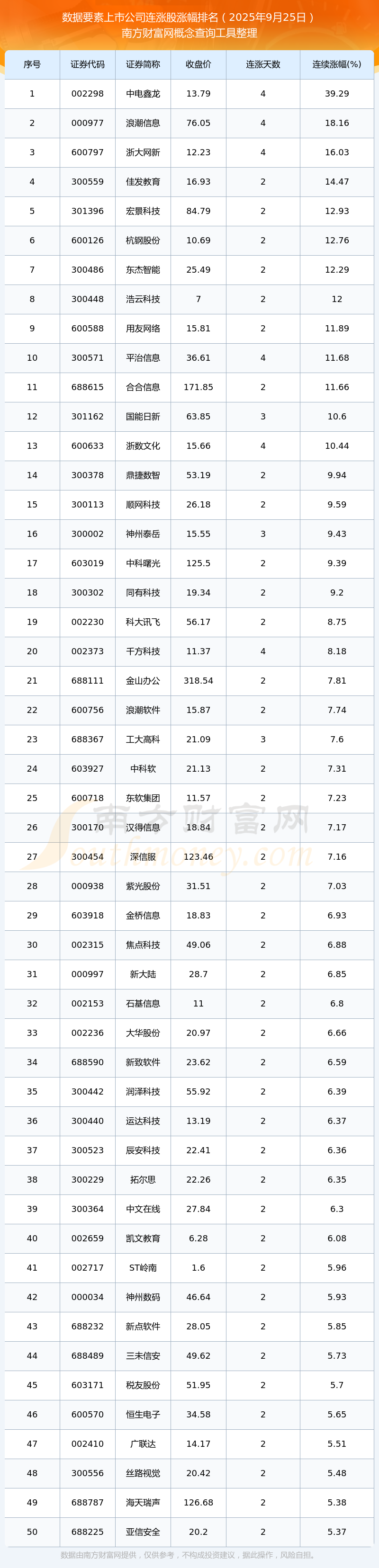 2025年9月25日數(shù)據(jù)要素上市公司連漲股漲幅排名