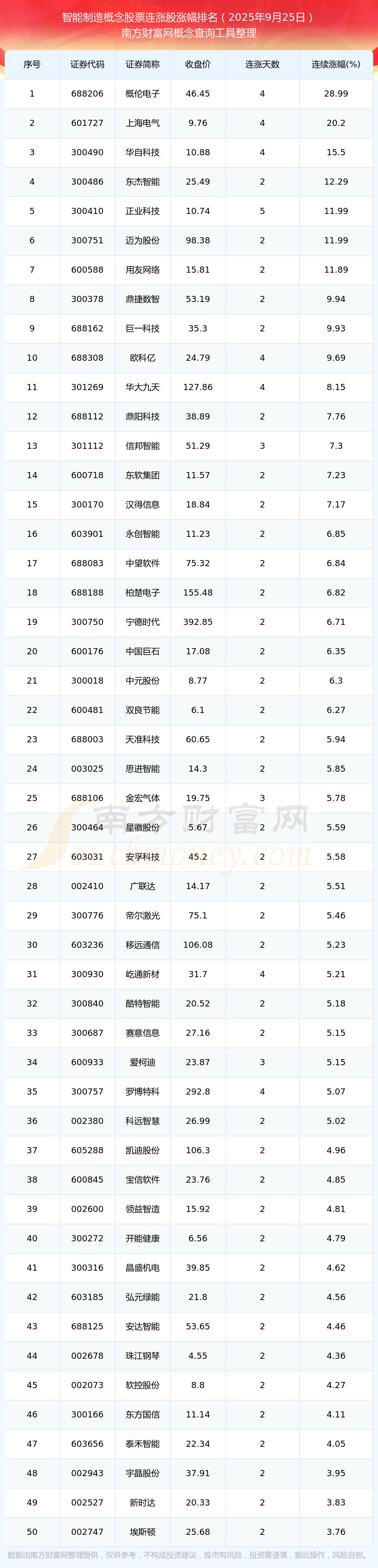 2025年9月25日智能制造概念股票連漲股漲幅排名