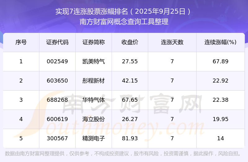 2025年9月25日實(shí)現(xiàn)7連漲股票漲幅排名