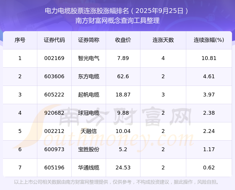 2025年9月25日電力電纜股票連漲股漲幅排名