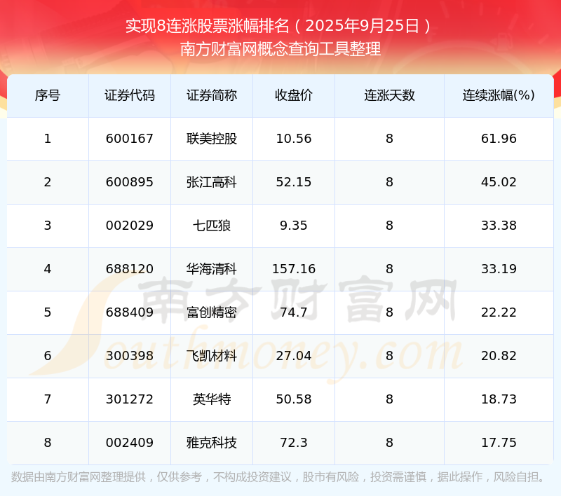 2025年9月25日實現(xiàn)8連漲股票漲幅排名