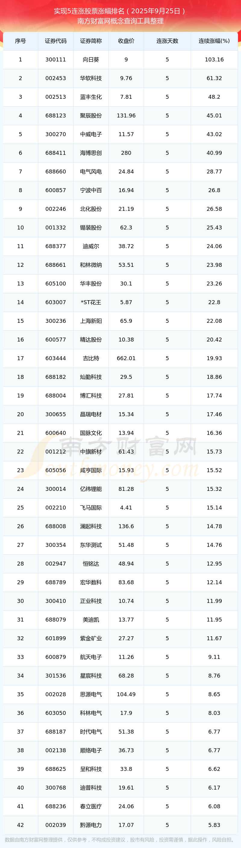 根據(jù)南方財富網(wǎng)概念查詢工具數(shù)據(jù)統(tǒng)計(jì),截止2025年9月25日收盤,共有42只個股實(shí)現(xiàn)5天連漲。其中連續(xù)漲幅較大的個股有向日葵、華軟科技、藍(lán)豐生化等,連續(xù)漲幅分別為103.16%、61.32%、48.20%。