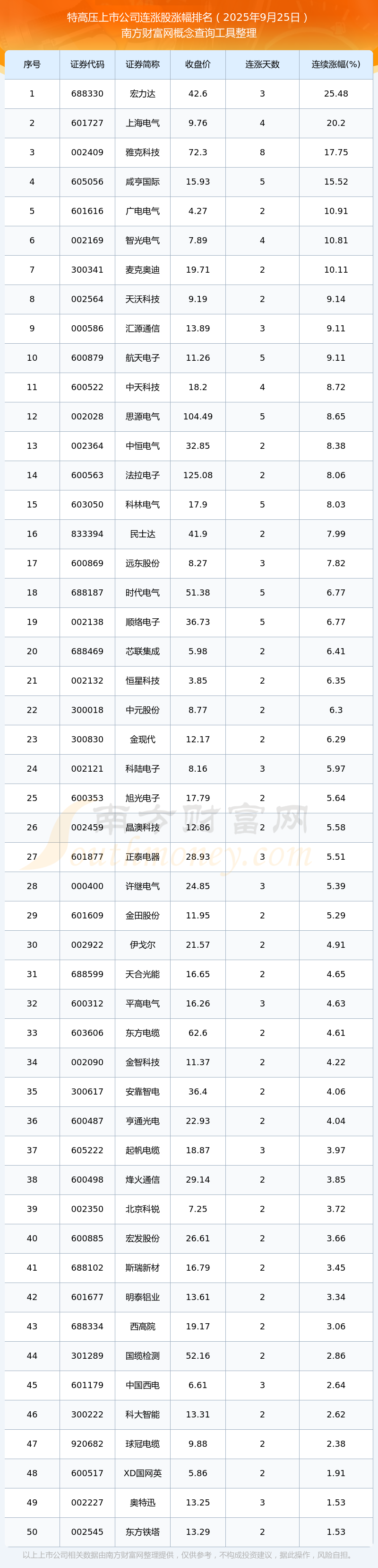 2025年9月25日特高壓上市公司連漲股漲幅排名
