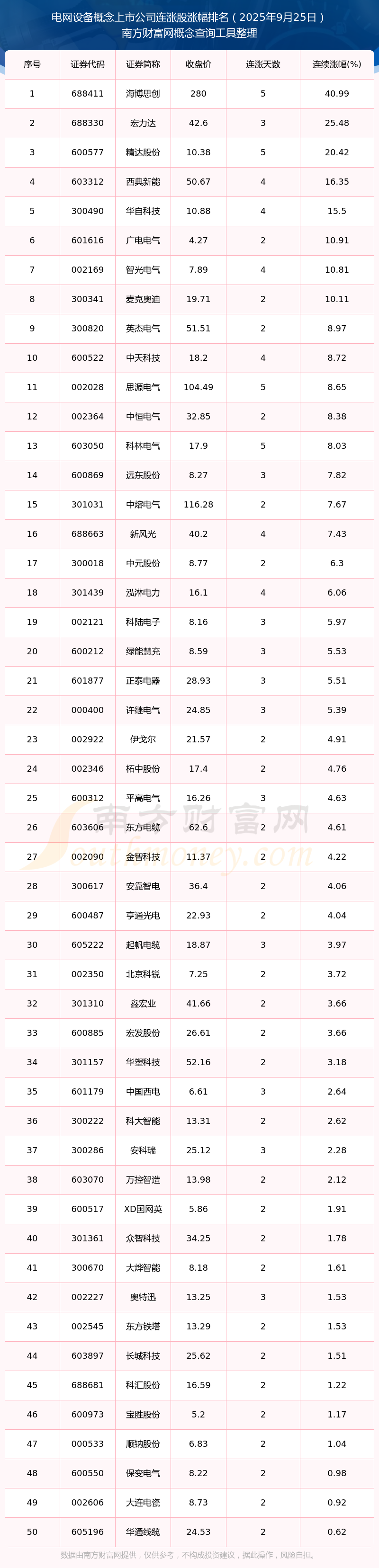 2025年9月25日電網(wǎng)設(shè)備概念上市公司連漲股漲幅排名