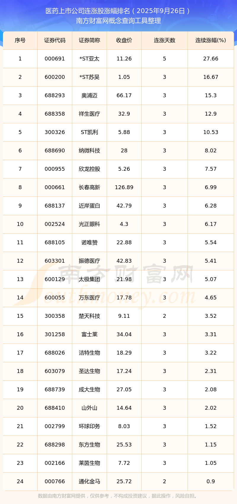 2025年9月26日醫(yī)藥上市公司連漲股漲幅排名