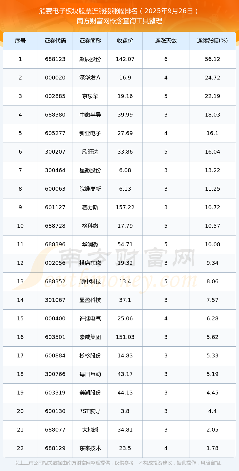 2025年9月26日消費(fèi)電子板塊股票連漲股漲幅排名