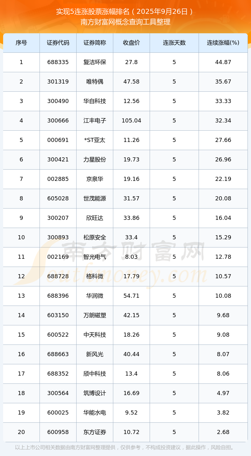 根據(jù)南方財富網(wǎng)概念查詢工具數(shù)據(jù)統(tǒng)計,截止2025年9月26日收盤,共有20只個股實現(xiàn)5天連漲。其中連續(xù)漲幅較大的個股有復潔環(huán)保、唯特偶、華自科技等,連續(xù)漲幅分別為44.87%、35.67%、33.33%。