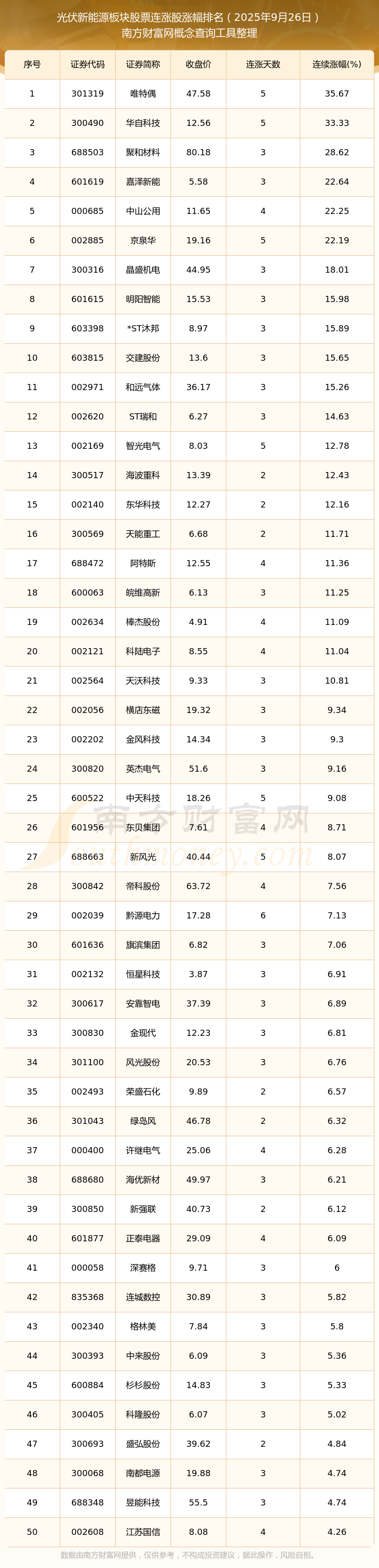 2025年9月26日光伏新能源板塊股票連漲股漲幅排名