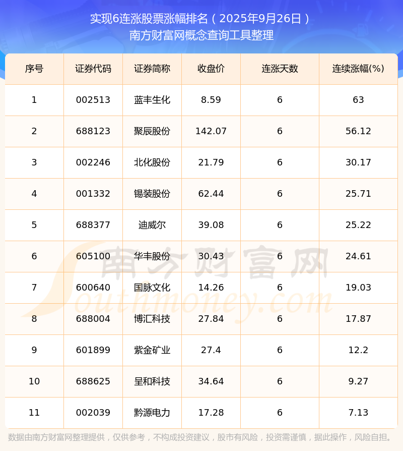 2025年9月26日實現(xiàn)6連漲股票漲幅排名