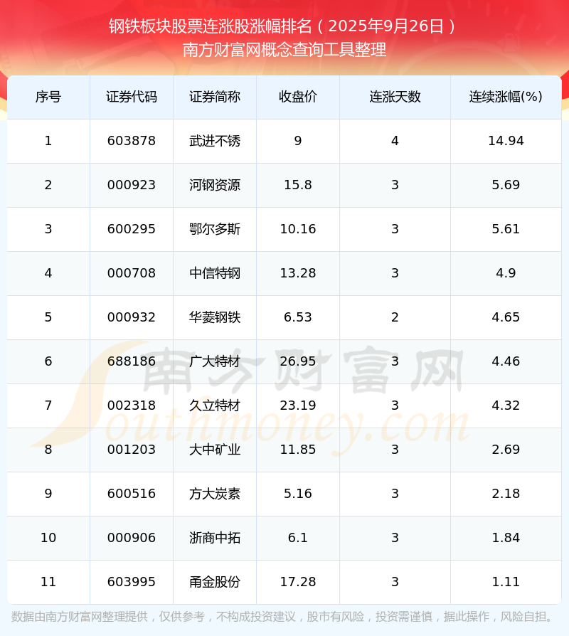 2025年9月26日鋼鐵板塊股票連漲股漲幅排名
