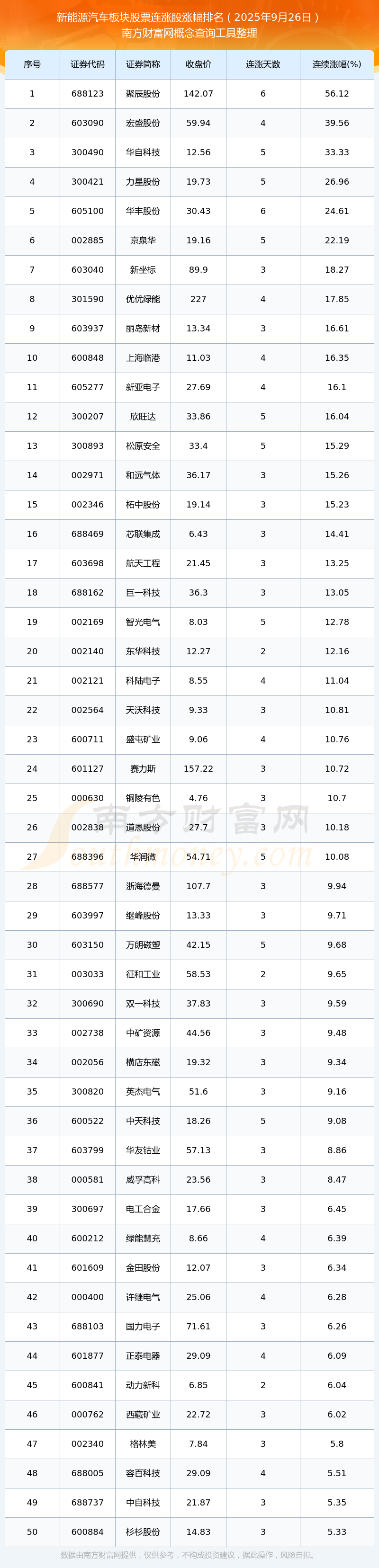 根據(jù)南方財(cái)富網(wǎng)概念查詢工具數(shù)據(jù)統(tǒng)計(jì),截止2025年9月26日收盤,新能源汽車板塊股票共有76只個股實(shí)現(xiàn)連漲。其中連續(xù)漲幅較大的個股有聚辰股份、宏盛股份、華自科技等,連續(xù)漲幅分別為56.12%、39.56%、33.33%。
