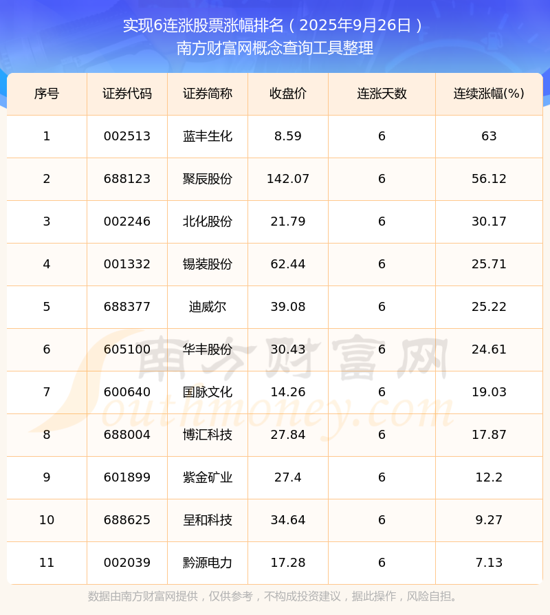 2025年9月26日實(shí)現(xiàn)6連漲股票漲幅排名