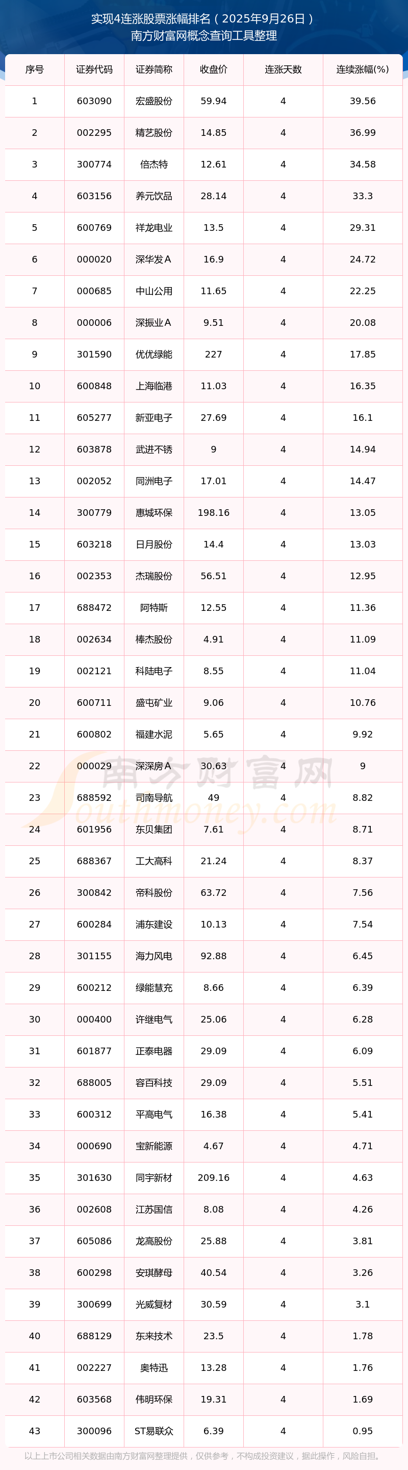 2025年9月26日實(shí)現(xiàn)4連漲股票漲幅排名