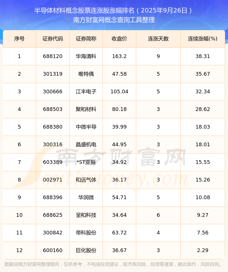 2025年9月26日半導(dǎo)體材料概念股票連漲股票漲幅排名